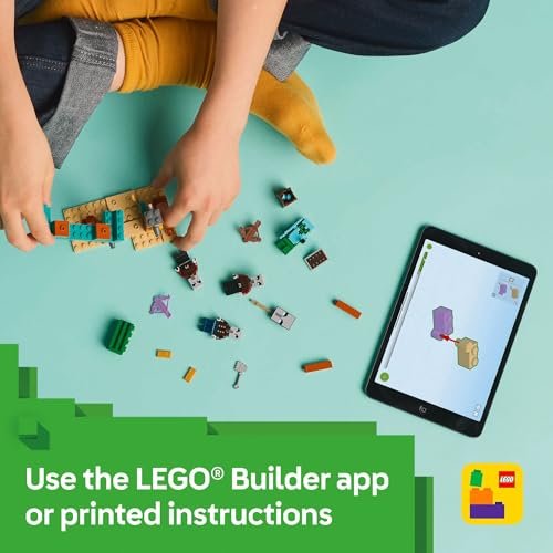 Set in a Minecraft desert outpost, kids role-play being a Cactus Knight, with its diamond armor and shield and sword. When 3 illager figures arrive to steal treasure, kids must defend the outpost. The set includes missiles that kids can launch with a flick of their finger, a variety of weapons and a barrel that holds the treasure. For extra digital fun, the LEGO Builder app lets kids zoom in and rotate models in 3D using their device.