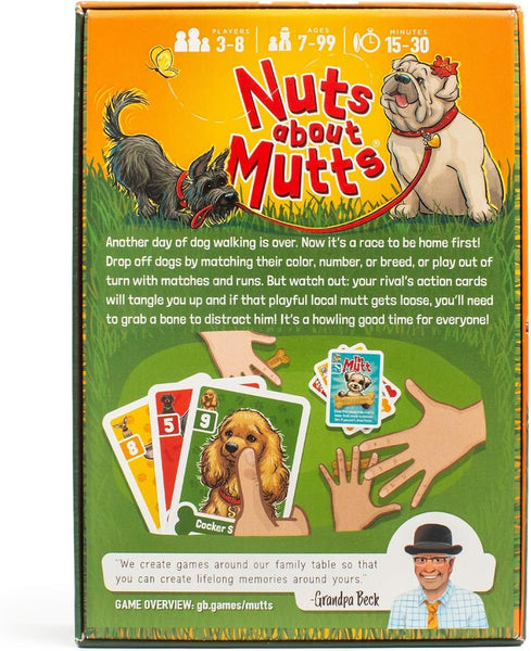- FUN FOR ALL AGES: Whether you are 5 or 105, Nuts About Mutts will bring out the rough-and-tumble energy and canine cunning needed to become top dog! Nuts About Mutts encourages bonding, helps create lasting memories, and inspires playful competition. The ultimate objective is fun! This game plays well with anywhere from 3 to 8 players, so whether hosting a playdate or having a game night with family and friends, Grandpa Beck’s fast-moving matching game will win with everyone.