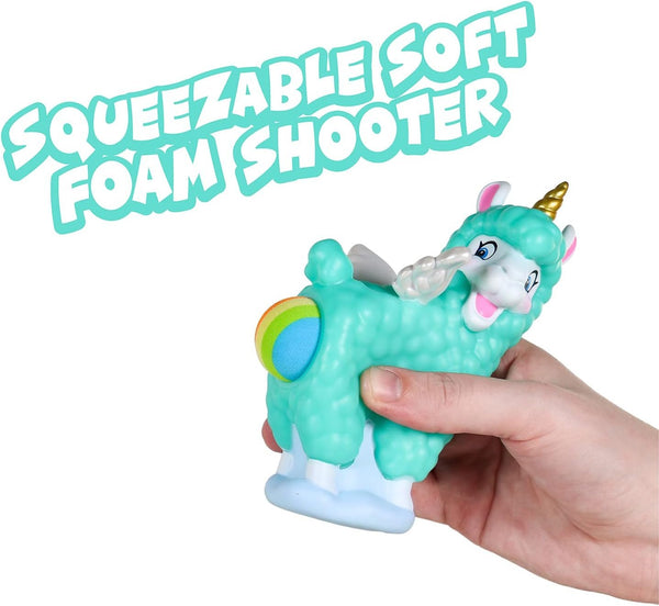 - Ready, aim, POP! Squeeze the Llamacorn Popper to shoot a soft foam ball up to 20 feet!
