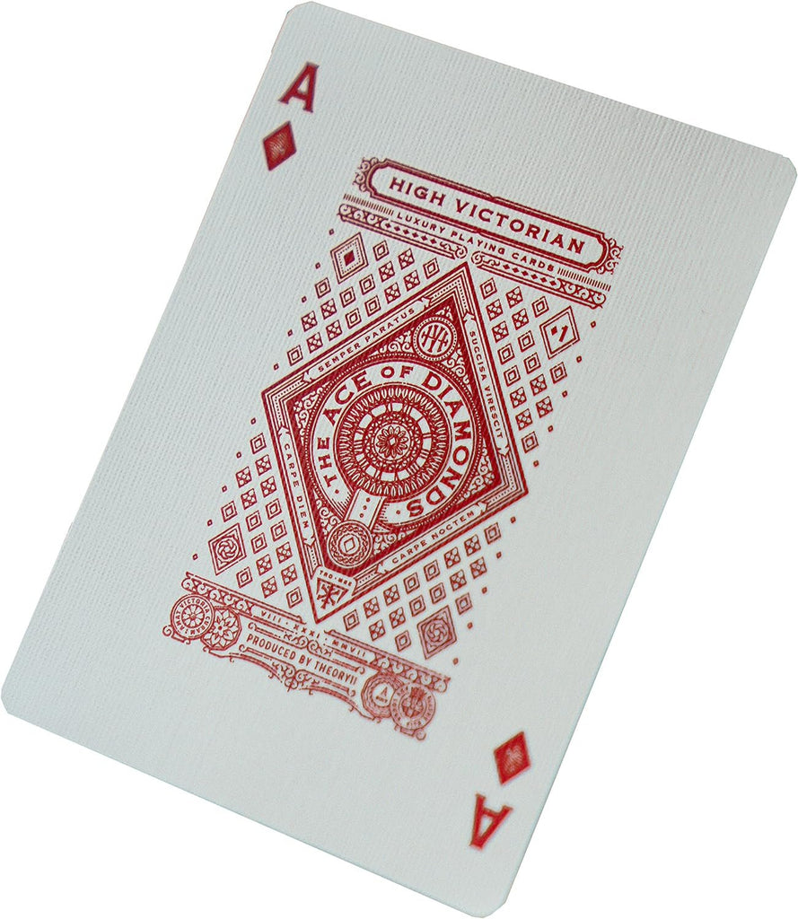High Victorian Playing Cards were inspired by the intricate, breathtaking style of the Victorian era. Every element was designed from scratch with painstaking, relentless attention to detail. Illustrated in London by Joe White, every single playing card within the High Victorian deck was designed from scratch - even the Aces, Jokers, and court cards exude the grand excess of ornamentation quintessential to the Victorian era. A three dimensional back design that seemingly adds more detail with each and every look. The back design is as detailed as it is UNIQUE. Over 18 months in the making - and it shows.Finely crafted, premium playing cards for the inquisitive mindShielded in gold and green foilMade in the USA on FSC-certified paper derived from sustainable forests using vegetable based inks