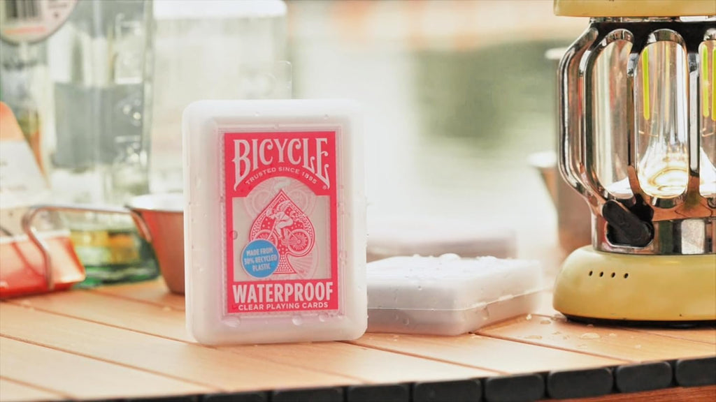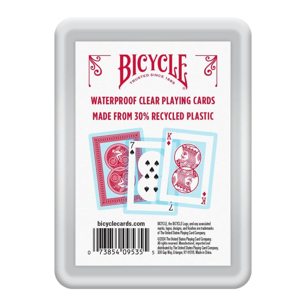 6-Deck Pack – Get six full decks of premium Bicycle waterproof playing cards, perfect for family nights, group play, party favors, or taking spares on outdoor adventures.Waterproof & Rinseable – Made from durable clear plastic (30% recycled content), these cards resist water, sand, and spills. Simply rinse off dirt or sticky messes and they’re ready to play.Bright Red Rider-Back Design – Classic Bicycle styling with a vivid red rider back. High visibility makes them easy to find in the pool, sand, or grass.Hard Clam-Shell Case – Each deck comes in a strong protective plastic case to keep cards secure during transport and storage, prevent warping or bending.Ideal for Outdoors & Travel – Perfect companion for beach trips, poolside lounging, camping, picnics, boat rides, BBQs – anywhere paper cards just won’t last. Durable, flexible, long-lasting.