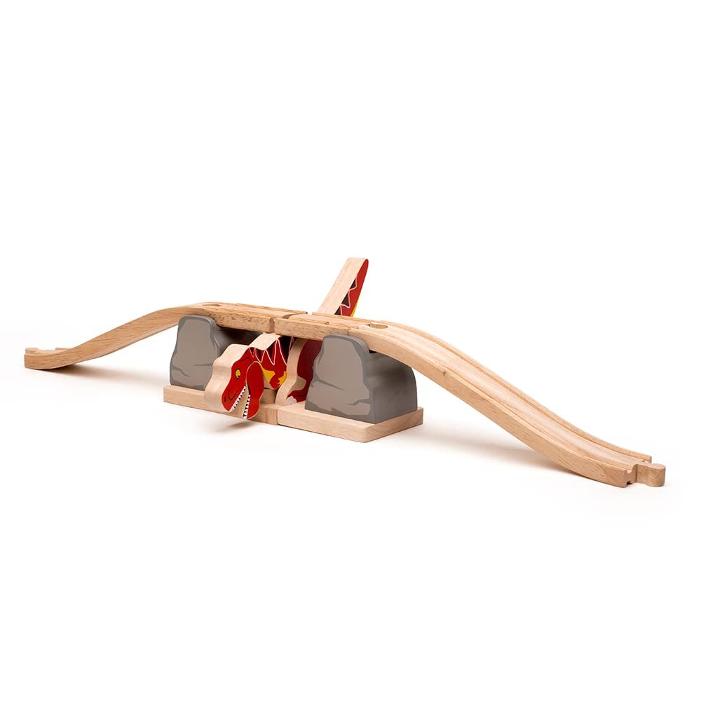 Mixing dinosaurs and trains makes for roarsome fun! This awesome prehistoric accessory will have young rail enthusiasts entertained for hours on end. Creative storytelling is naturally inspired as the hungry dinosaur crashes through the bridge, causing the track to break and even send trains flying off the track! Complete with ascender and descender track. Encourages creative and imaginative roleplay. Most other major wooden railway brands are compatible with Bigjigs Rail. Made from high quality, responsibly sourced materials. Conforms to current European safety standards.DINOSAUR TOY BRIDGE - Watch out for the angry dinosaur and cross the bridge before it comes crashing through the wooden track! A fun addition to any wooden train set! Ascender and descender track.WOODEN TOYS FOR 3 YEAR OLDS - This dinosaur Bigjigs train accessory is a great gift for kids aged 3 yrs +. Pair with our Dinosaur Train Set for prehistoric fun! Compatible with other wooden railways.DINOSAUR TOYS - Dino-mad kids will love this train set accessory to liven up their dinosaur track. Complete with ascender and descender track. Encourages creative and imaginative roleplaySAFE AND SUSTAINABLE WOODEN TOYS - Our wooden toys are made from premium quality, sustainably sourced wood. Conforms to EN71 Toy Safety Standards and has non-toxic paints and lacquers.EDUCATIONAL TOYS - This dinosaur train set accessory encourages dexterity, hand-eye coordination and fine motor skills as children run their toy trains up and over the bursting T-Rex bridge.