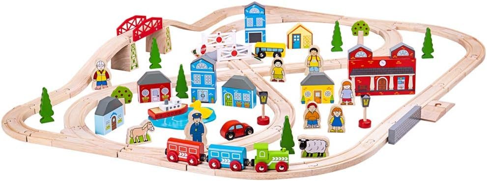 The Bigjigs Rail Town and Country Train Set will inspire and educate young minds in equal measure. Take a ride to the shops, steam through the level crossing, pass through woodland and out to the river before returning home. This 101 piece set includes high quality wooden tracks, wooden houses, cars, town and country folk, a level crossing and even a boat, duck and pond! Plus, a sturdy wooden engine with three colorful carriages. This extensive set includes enough track to create a new layout for every play session, creating endless playtime possibilities. Additional accessories are available to expand this set. Most other major wooden railway brands are compatible. Includes 101 play pieces. Made from high quality, responsibly sourced materials. Conforms to current ASTM and CPSIA safety standards. Width: 40.16", Depth: 30" (assembled).Set contains 101 pieces. The passengers must make sure they know which line the train is going on, or they could arrive at the orchard instead of the post office . The train with two carriages and a guards van is travelling through the town over the bridge and out into the countryside, passing houses, trees, and a lovely church. Vehicles wait patiently at the level crossing for the train to pass arriving at the station right on time Established in the UK in 1985 BigJigs Toys is a family business through and through. Over the last 25 years we have grown into an extended family though a team of dedicated staff. After many years developing the range in the UK and Europe we are now delighted to be launching our range into the United States. BigJigs Toys prides itself on providing great quality products combined with a high standard of service and delivery. All products in the US collection are tested to meet ASTM requirements and CPSIA regulations. Consisting of wooden train track, wooden train sets, wooden trains, train tables, accessories and much more our trains are compatible with other leading wooden railway systems. BigJigs Rail is the perfect choice for any Wooden Railway collection.TOWN AND COUNTRY WOODEN TRAIN SET - Enjoy the buzz of the town and the peace of the countryside! 87 pieces wooden train set incl. wooden houses, figures, trees, cars and more. 76cm x 10cm H x 102cm W.WOODEN TOYS FOR 3 YEAR OLDS - This Bigjigs train set is a great gift for kids aged 3 yrs +. Additional wooden train set accessories are available to expand this train set.MONTESSORI TOYS - Wooden houses, cars, town and country folk plus a level crossing and a boat will keep little ones entertained with endless wooden railway play scenarios.SAFE AND SUSTAINABLE WOODEN TOYS - Our wooden toys are made from premium quality, sustainably sourced wood. Conforms to EN71 Toy Safety Standards and has non-toxic paints and lacquers.EDUCATIONAL TOYS - This wooden train set encourages dexterity, hand-eye coordination and fine motor skills as kids piece the wooden train track together to build their town and country railway.