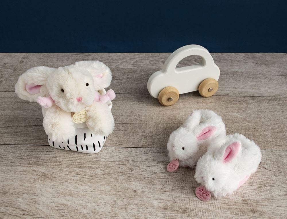 Doudou et Compagnie Pink Bunny Booties with Rattle – Baby Slippers Gift Set, Soft Bunny Design, 0-6 Months (DC1308)