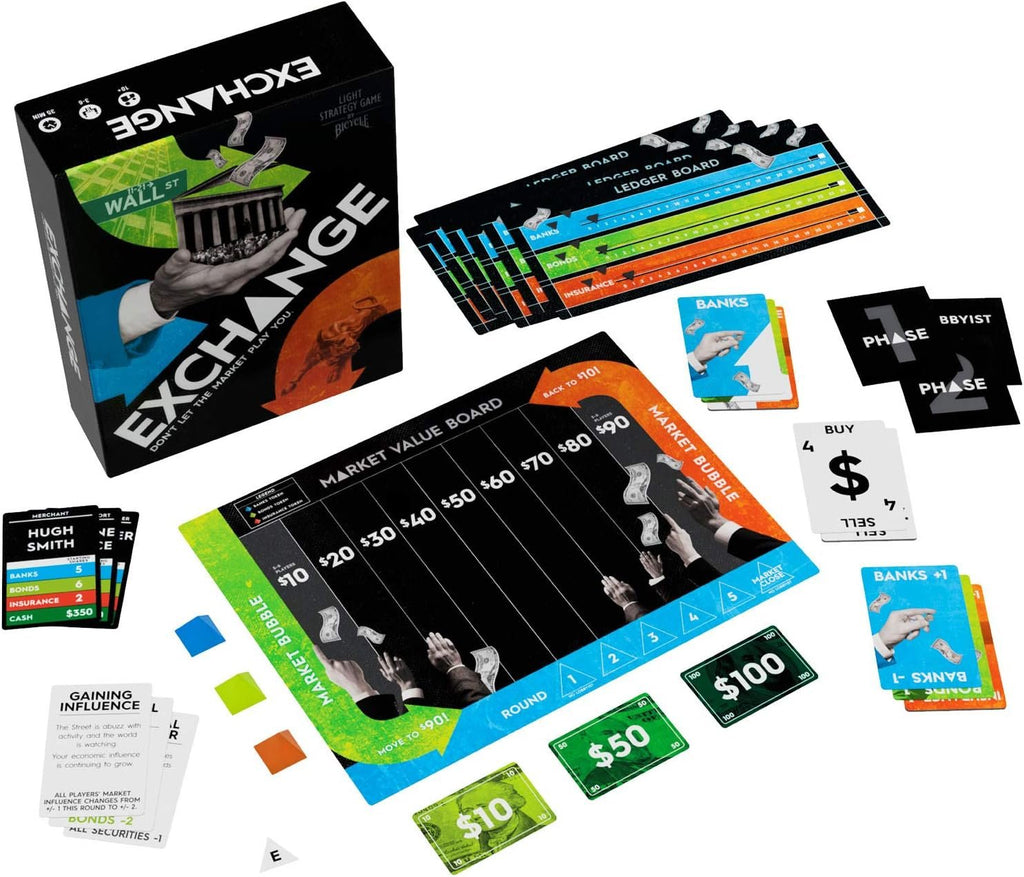 In Exchange, you are a securities trader competing for the highest net worth on Wall Street. Players will carefully plan their strategies over five rounds, trying to cash in big in a constantly changing market! The only thing harder than trying to predict the market is anticipating the actions of your witty friends sitting at the table with you. In the end, the player who corners the market and has the highest net-worth will win the game and the title of the best trader on the Exchange.