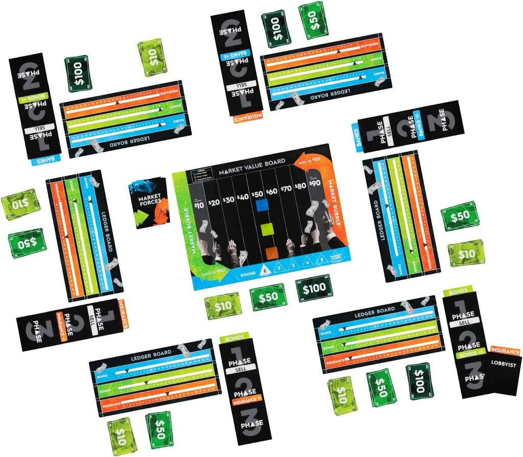 The game lasts a total of 5 rounds and each round consists of 3 phases. Phase 1: Select a security; Phase 2: Buy or Sell; Phase 3: Influence the Market. If you really want to get ahead, you can pop the market bubble! If a security increases above the highest value or drops below the lowest value, the Market Bubble "pops" and the price of that security will flip to the other side of the board, resulting in a huge shift in price.