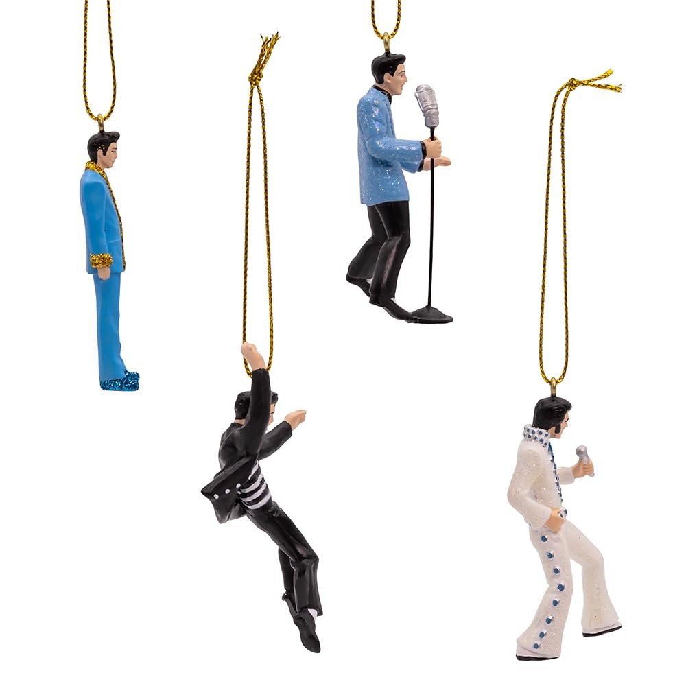 Kurt Adler 4pc Elvis Presley? Miniature OrnamentsOrnamental Splendor: Each miniature Elvis Presley ornament captures the King's iconic style and charisma in a compact size, perfect for adding a touch of musical nostalgia to your holiday decor.Iconic Variety: From his signature Jailhouse Rock outfit to classic stage poses, each ornament in this four-piece set showcases Elvis in a different iconic look, ensuring a diverse and captivating display.Gift of Musical Joy: Ideal for Elvis fans and music enthusiasts alike, this ornament set is not only a festive addition to your decor but also a thoughtful gift that celebrates the timeless appeal of the King's music and style.Rock 'n' Roll Delight: Share the joy of the holidays with friends and family by gifting this collectible set, guaranteed to evoke smiles and fond memories of Elvis's musical legacy for years to come.