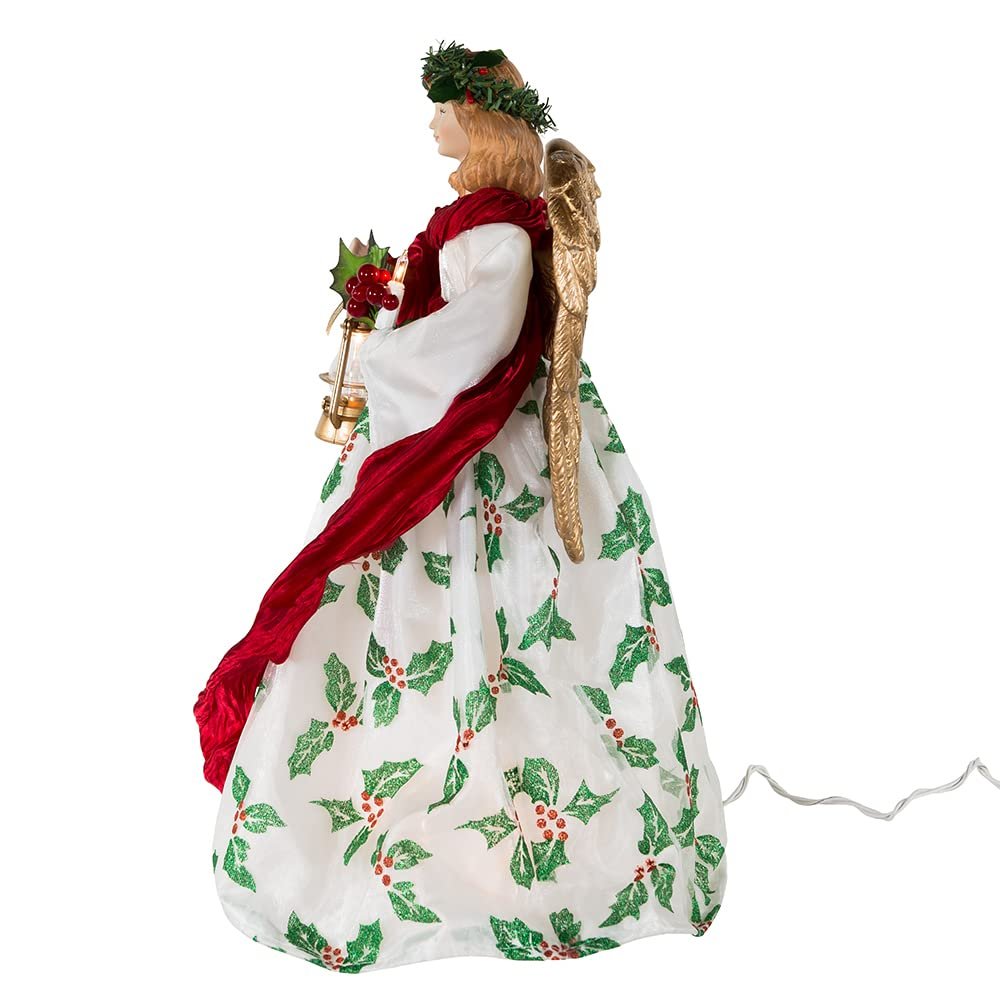 This Kurt Adler 16" Irish Angel Treetop is a beautiful and unique addition to your Christmas tree décor. This angel is wearing a beautiful white gown adorned with a glittered holly leaf and berry design and has red ribbon accents. She has gold glittered wings and is holding a lantern in on hand a lighted candle with holly leaf and berries accents in the other hand. Upon her head is a beautiful crown of holly leaves and berries.