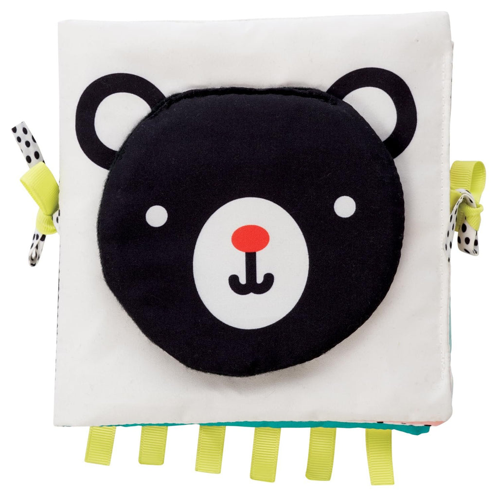 Compact for travel - great for the diaper bagHigh-contrast black and white + colored graphics for fostering baby’s vision progressionBaby-safe mirror for self-discovery and peek-a-boo playVariety of soft fabric textures and crinkle sounds for sensory discovery and auditory stimulationPeek-a-boo flaps, fabric ribbons, and a lightweight design offer an easy-to-grasp toy to help foster motor skill development