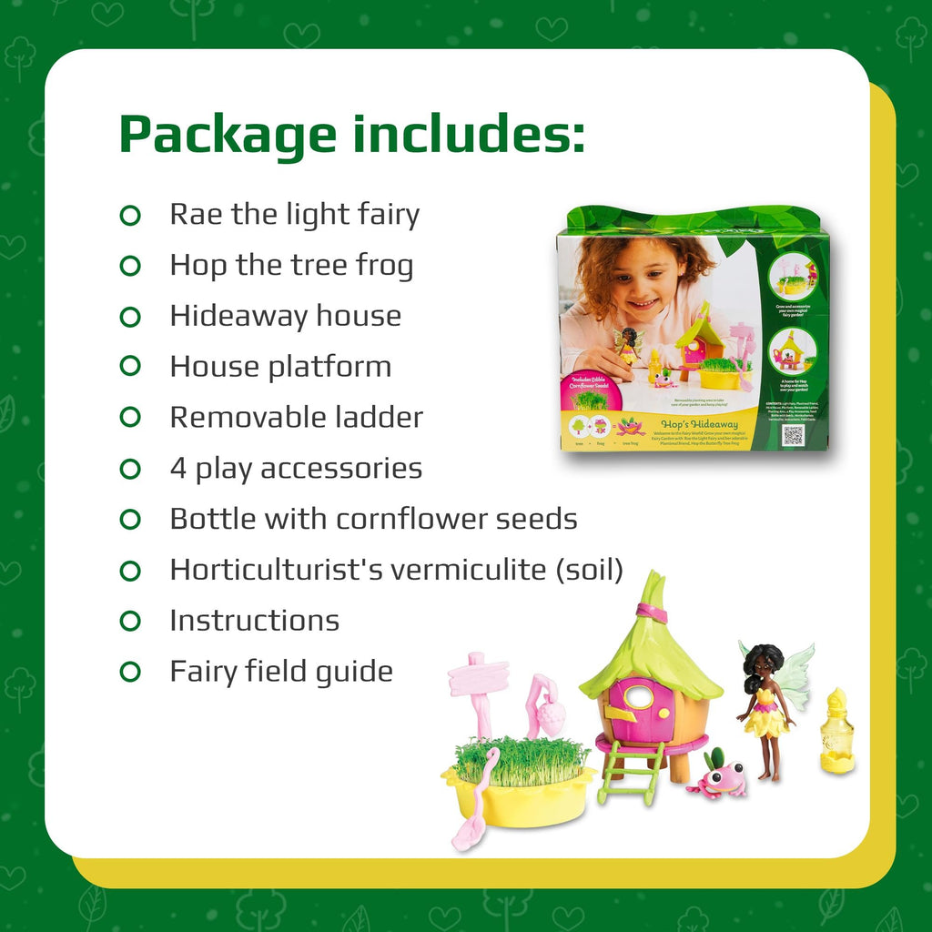 HOP'S HIDEAWAY: Welcome to Hop's Hideaway, where Hop and his fairy friend Rae can play and explore while exploring and tending to their magical garden through planters and play!GROW & PLAY: Each My Fairy Garden kids play set comes with seeds to plant and care for as you grow your very own magic garden! Connect Hop's house to the planter with the ladder to help him keep an eye on your garden while you're away! Then disconnect it when it's time to play!INTRO TO THE ENVIRONMENT: My Fairy Garden introduces kids ages 4 and up to the concept of caring for the environment through the field guide and growing their garden in a fun and magical way! My Fairy Garden is partnered with One Tree Planted, so each purchase contributes to planting trees around the world!FAIRY FIELD GUIDE: Open up the fun Fairy Field guide for all sorts of magical nature fun! Learn more about the fairy's mission to protect the environment and how plants are able to grow. Learn about Rae and Hop while trying out some fun nature activities to become an official Nurturer of Nature!JUST ADD WATER TO GROW SEEDS: Hop's Hideaway comes with everything you need to get started, including seeds and soil! Just add water to your planted seeds and watch your world grow! Comes with Rae the light fairy, Hop the tree frog, the hideaway house, a house platform, a removable ladder, 4 play accessories, a bottle with cornflower seeds, horticulturist's vermiculite (soil), instructions, and the fairy field guide.