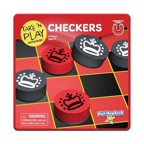 PlayMonster Take 'N Play Anywhere — Checkers — Magnetic Travel Game — Fun on The Go! — for Ages 4+CLASSIC GAME—Enjoy the easy game of Bingo wherever you goTRAVEL FRIENDLY—Take ‘N’ Play Anywhere games are perfect for on the go with large pieces and magnetic game boardsENTERTAINMENT ANYWHERE—Use at home or take in the car, to the doctor’s office, grandma’s house, or anywhere else to always have something to doCOMPACT SIZE—The tin case makes it easy for games to fit in most bags for easy travelCOMES WITH EVERYTHING YOU NEED—Magnetic pieces all fit nicely into the magnetic tin game boardThe classic bingo game in magnetic, travel-size form!For 2 players, ages 4 and up