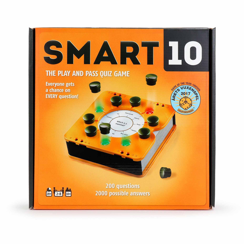 SMART 10 is the portable quiz game where every card has a question with ten possible answers, so every player gets a chance to show off their smarts! Players take turns guessing answers and passing to the next player. Right answers gain a point, but players beware, incorrect answers lose everything earned that round. Play smartly, as pass or play decisions can make or break the game! The first player or team to reach 30 points wins!