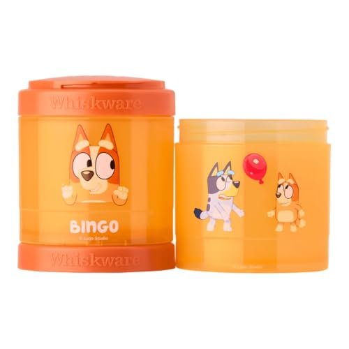 Whiskware Stackable Snack Packs with Bluey Designs bring an eco-friendly ways to pack healthy homemade snacks. Versatile, stackable, interlocking containers are perfect for on-the-go snacks or lunches. Each set comes with three dishwasher safe jars: 1/3 cup - 3oz, 1 cup - 8oz, and 1 cup - oz. The jars can be used alone or easily connected together with the quick-turn Twist 'n' Lock system. The removable carrying handle makes it easy to carry the battery or clip it to a backpack or bag. Perfect for fruits, vegetables, cookies, mixed nuts and toppings. Or fill them with small treasures and toys. BPA and phthalate free; Dishwasher and freezer safe.